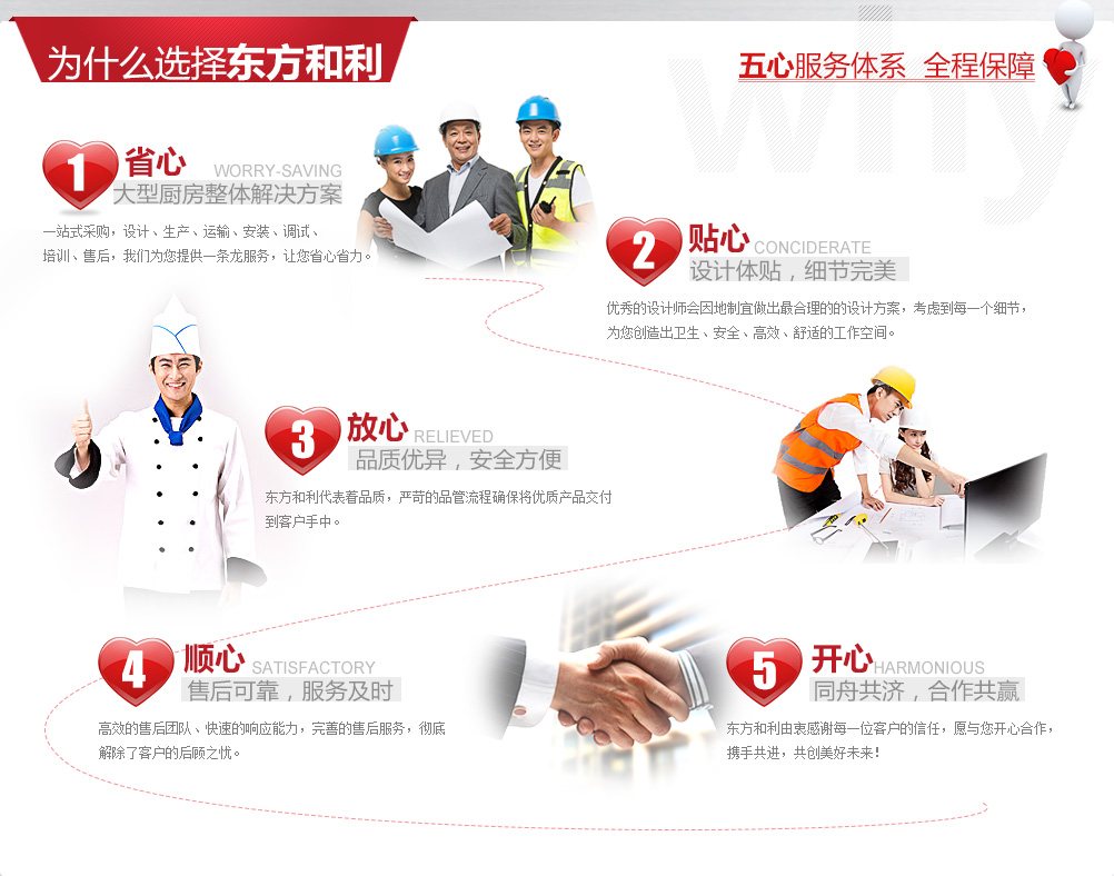 廚房工程建設是一項龐大復雜的系統工程,既需要與后勤工作人員、廚師溝通協調, 又要與土建、裝修、機電、暖通等工程人員相互配合,工作量十分巨大。同時還要采購眾多的食品機械、工具,這對沒有相關經驗的我們來說確實是一個挑戰(zhàn)。有時候我們面對廚師提出的長長的采購需求清單就已經眼花繚亂了。 幸好東方和利提供的是整體解決方案,從前期的設計咨詢到后期的安裝調試、從大型設備到餐具小件,包括各種食品機械,排煙通風,這些瑣碎事情都由東方和利來完成,為我們提供量身定制的解決方案。一站式采購為我們節(jié)省了大量精力,而且所有廚具都由東方和利來保修,對我們來說也更加方便??傊?,東方和利的服務讓我們非常省心,我很滿意。